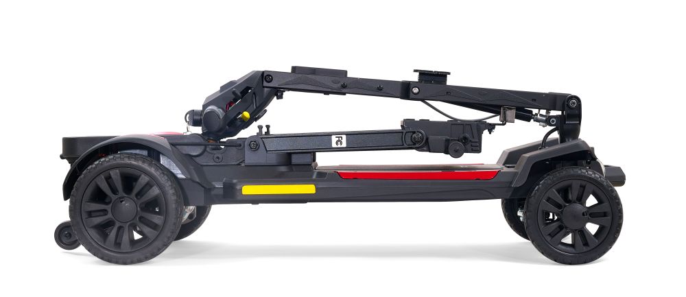 The Buzzaround CarryOn foldable scooter is small in stature and big on fun! This new sporty, super portable scooter will take you where you want to go in comfort and style! It features an infinitely adjustable tiller, full front and rear lighting package, 2 lithium-ion battery packs, and 300 lb. weight capacity. The heaviest piece is 47.5 lbs. (without seat and batteries) and the height when folded is only 12". This lightweight, folding mobility scooter disassembles easily into a few pieces and is designed to store in the smallest compartments. Pack your dreams and go anywhere with the CarryOn travel scooter!